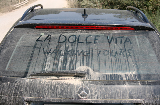 A Dolce Vita car gives evidence of the dirt roads we travel
